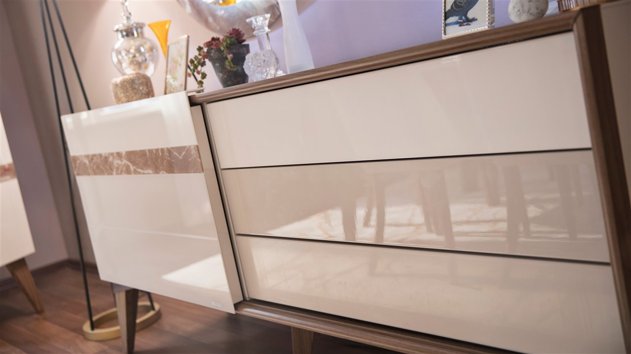 • Görsel algısını üst düzeye taşıyan farklı tasarıma sahip büfe ünitesinde kullanılan sürgü kapılı dolap mantığı ve çekmece özelliği sayesinde fonksiyonellik artırılmıştır.