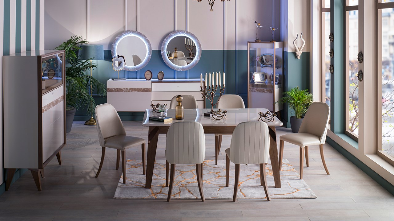 • Scarlet Yemek Odası Takımı renk konfigürasyonunda krem, kapiçino renk ve mermer desen kullanılmış olup, tarzı ile görsel açıdan oldukça şık bir tasarıma sahiptir.