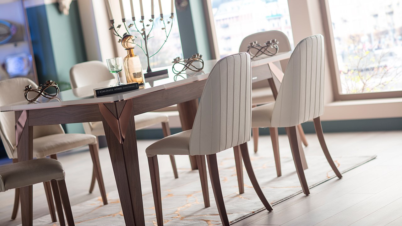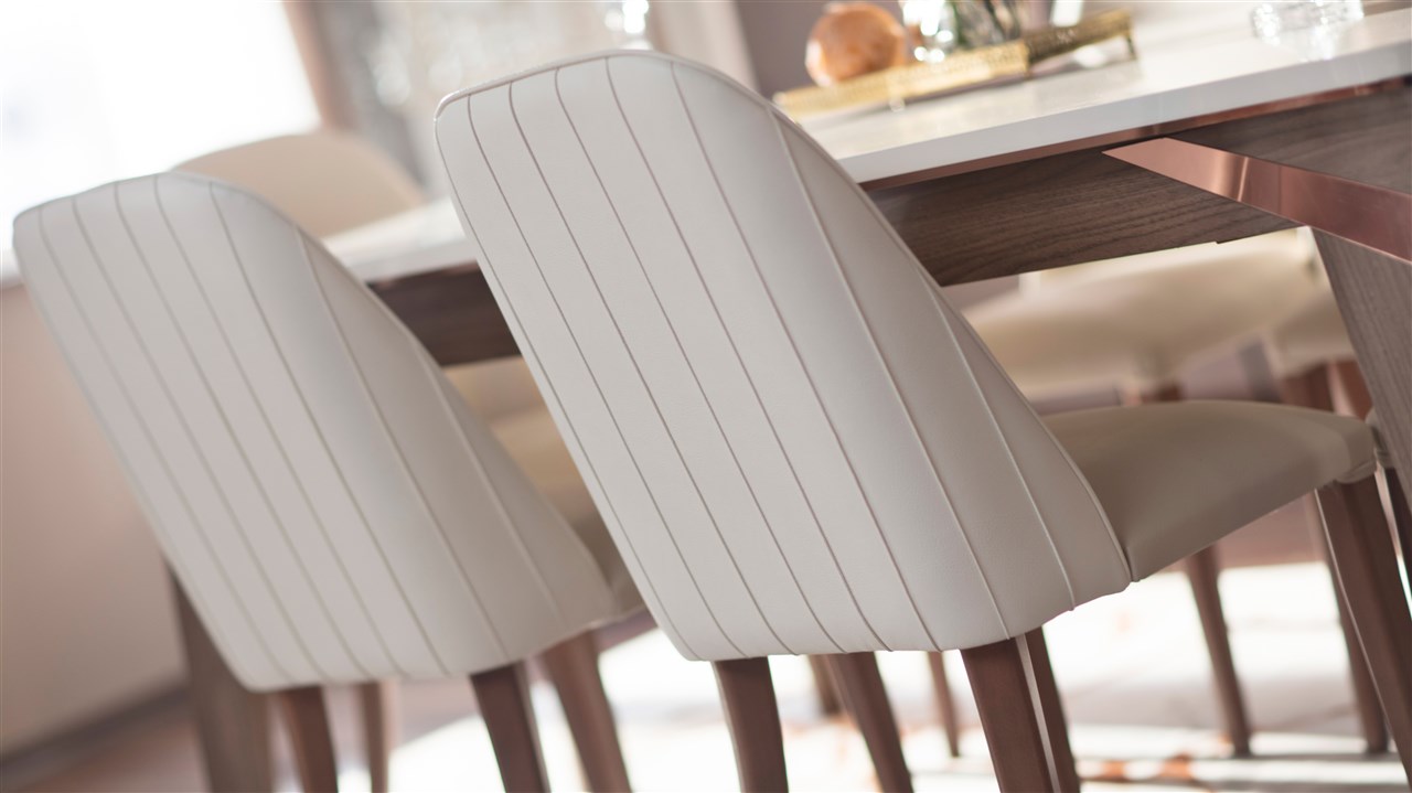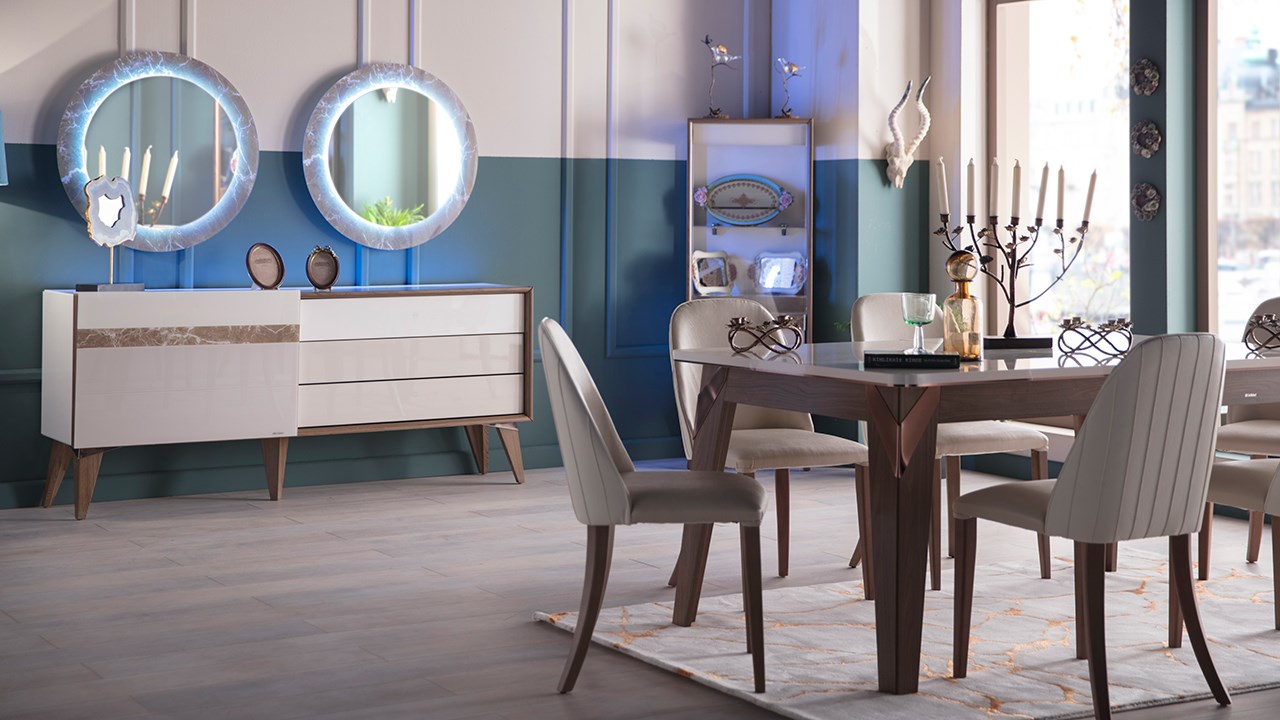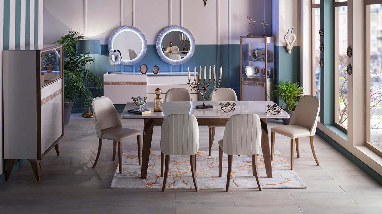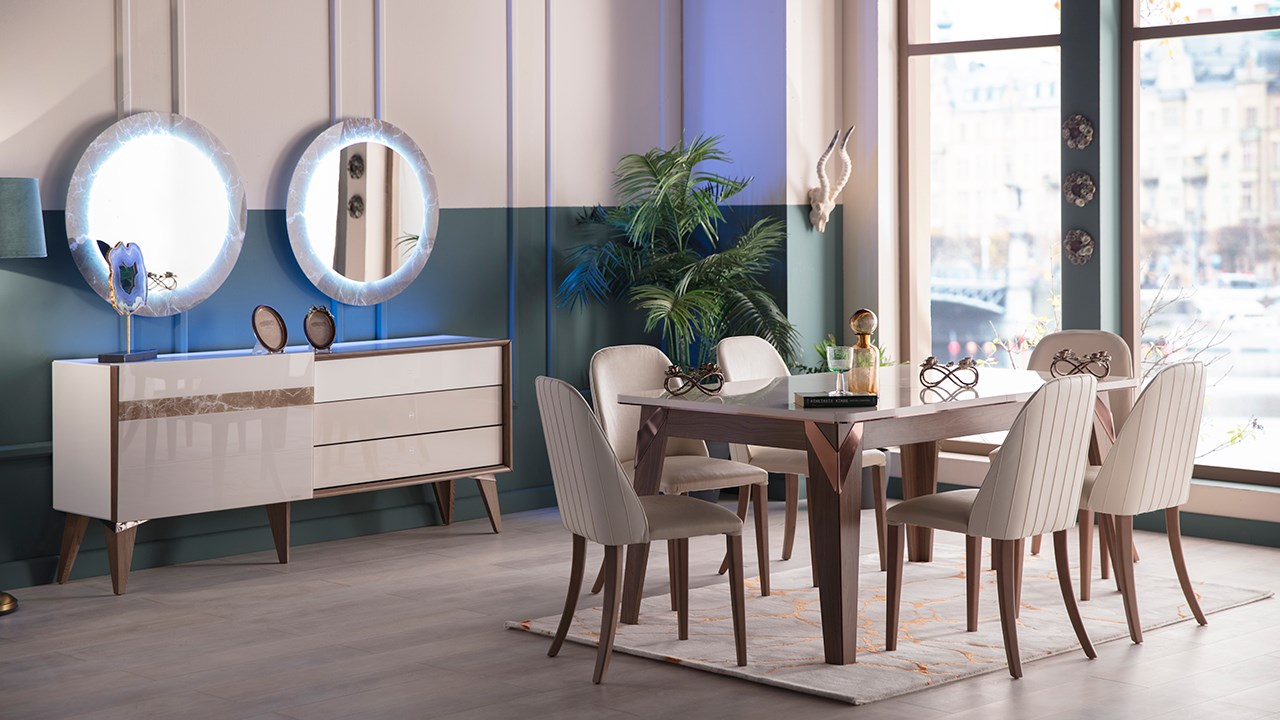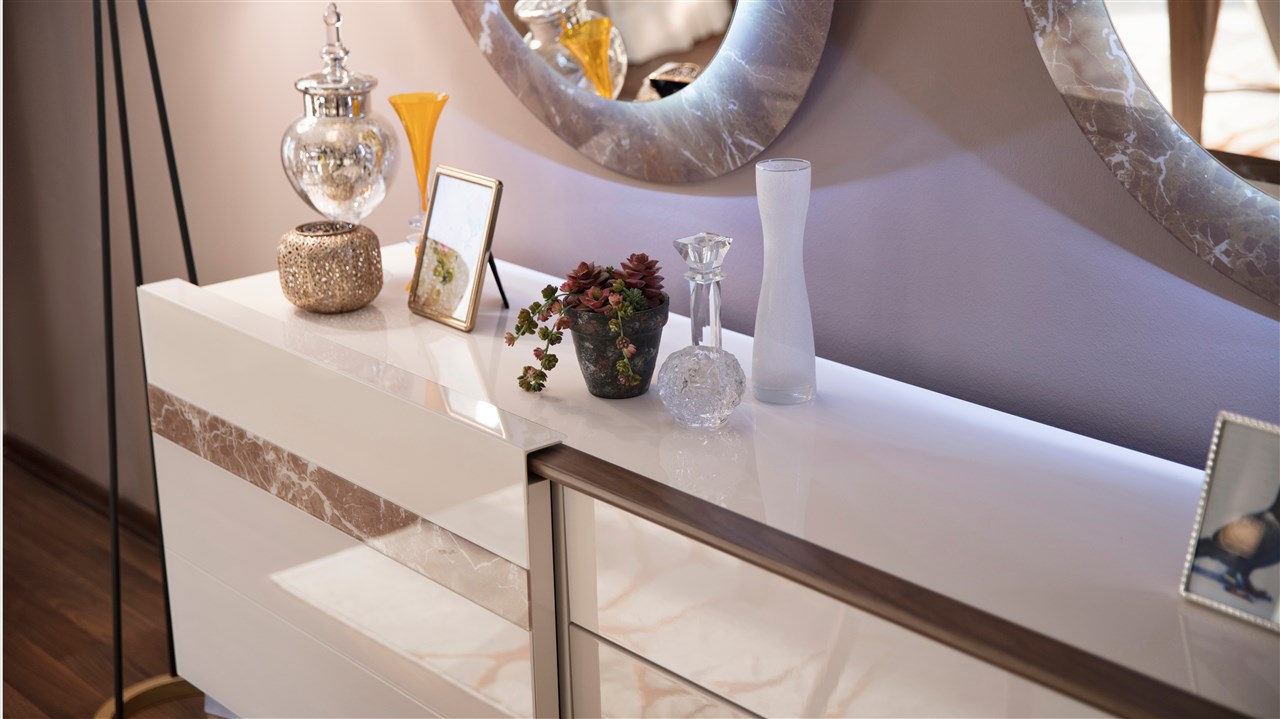 • Birbirini tamamlayıcı renk uygulamaları, ünite ayakları ve masa ayaklarındaki bakır detaylar,  mermer görünümlü etkiye sahip uygulamaları ve parlak görünümü ile son derece şık bir üründür.